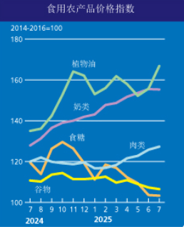 7月平均为130。1点,较6月上涨1。6%。虽然谷物、乳成品和食糖价钱指数下跌,但肉类和动物油价钱指数的上涨幅度更大。总体而言,本月食物价钱指数比2024年7月高7。6%,但仍比2022年3月峰值低18。8%。