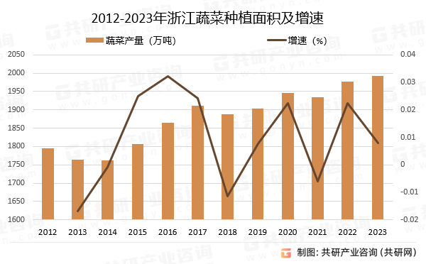 近年来,生果、食用菌等农业从导财产,不竭优化农业出产布局,积极鞭策特色农业成长,添加绿色优良农产物供应,蔬菜产量跃居农产物产量首位。2012-2023年,浙江蔬菜产量从1794。38万吨波动增加至1992。51万吨,增加了198。13万吨,增幅为11。04%。