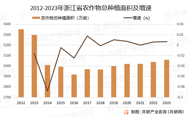 2012-2016年,浙江农做物总种植面积呈逐年下降态势,谷值为2016年的2919。68万亩;受省及相关部分持续出台的农业财产相关政策的激励,2017-2023年,浙江农做物总种植面积波动回升,并于2020年再次跨越3000万亩,2023年已达3062。08万亩,因种植业高度依赖地盘资本,估计后期农做物总种植面积仍将不变正在3000万亩以上。