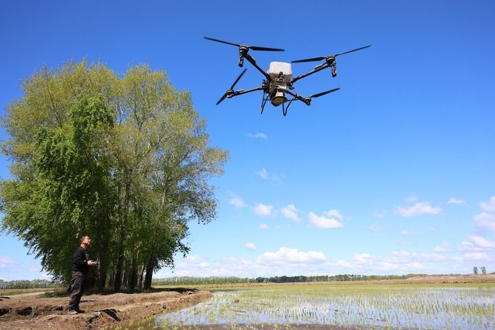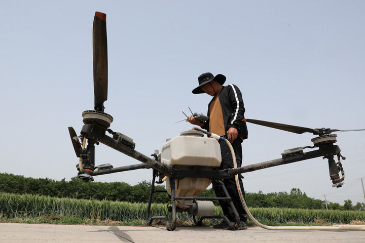 2025年5月7日,村平易近为植保无人机添加药液开展“一喷三防”。发(徐宏星摄)?。