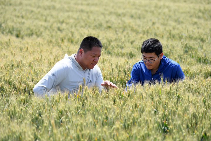 贾俊杰(左)和农业手艺员正在山西运城永济市虞乡镇麦田里查看小麦发展环境(2025年5月21日摄)。发(摄)?。