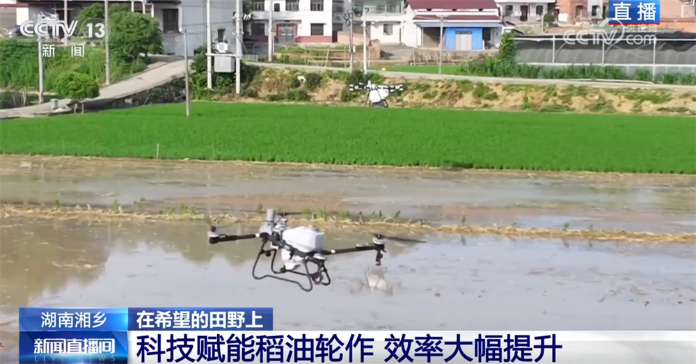 正在这个阶段,还有一件很是主要的工做就是施肥。眼下,施肥曾经很少依托人工了。现场,大型的农业无人机正正在功课,肥料平均洒正在田里。无人机还能做到从动避障、从动调理喷洒量,功课1亩地只需要不到20秒。