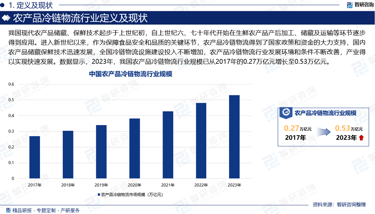 本演讲汇聚了智研征询研究团队的集体聪慧,连系国表里权势巨子数据,深切分解了农产物冷链物风行业的成长示状、合作款式以及将来趋向。我们秉承专业、严谨的研究立场,通过度、全方位的数据阐发,力图为读者呈现一个清晰、立体的行业画卷。
