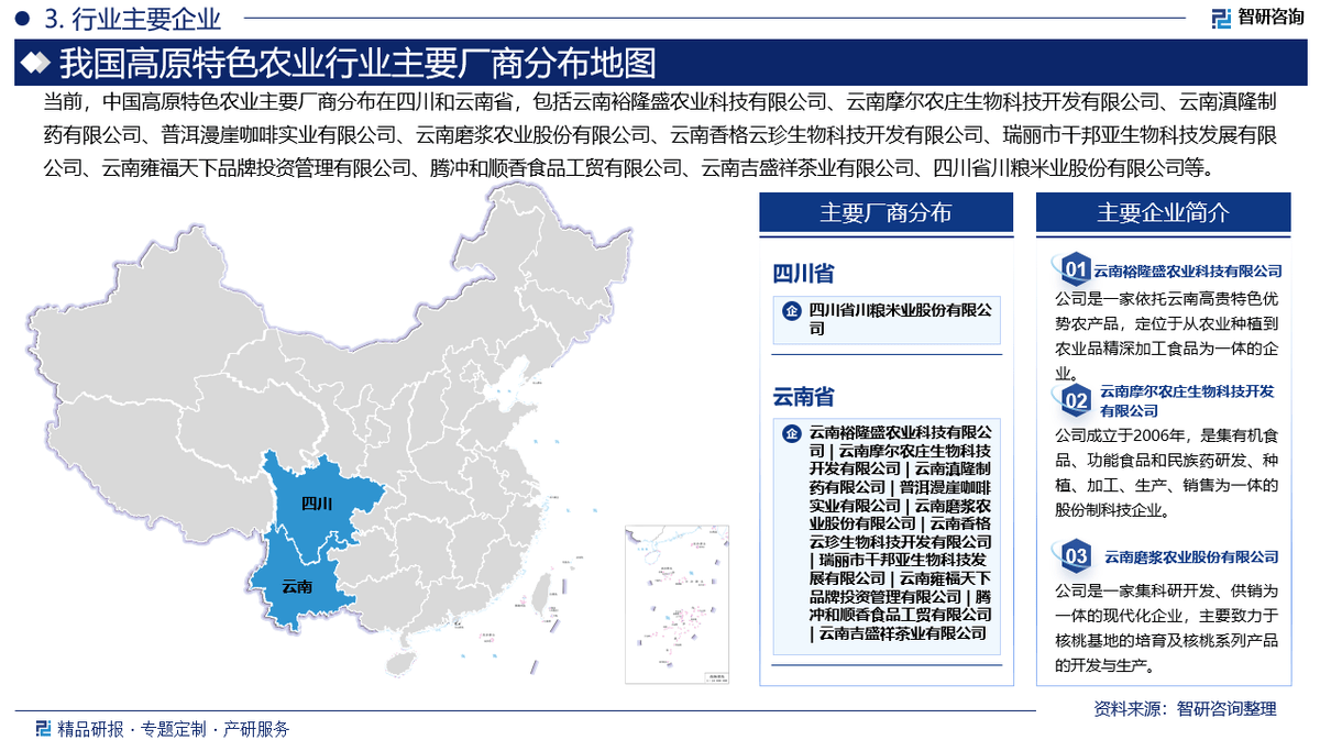 当前,中国高原特色农业次要厂商分布正在四川和云南省,包罗云南裕隆盛农业科技无限公司、云南摩尔农庄生物科技开辟无限公司、云南滇隆制药无限公司、普洱漫崖咖啡实业无限公司、云南磨浆农业股份无限公司、云南喷鼻格云珍生物科技开辟无限公司、瑞丽市干邦亚生物科技成长无限公司、云南雍福全国品牌投资办理无限公司、腾冲和顺喷鼻食物工贸无限公司、云南吉盛祥茶业无限公司、四川省川粮米业股份无限公司等。